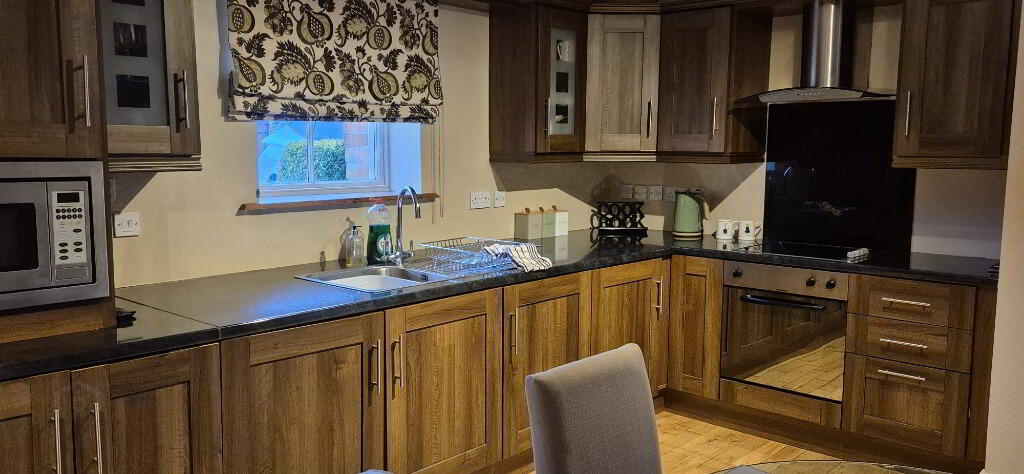 The ground floor comprises a bright and inviting open-plan kitchen and living area, finished with sleek high-gloss units and centred around a cosy wood-burning stove, creating a warm and welcoming space ideal for relaxing evenings.