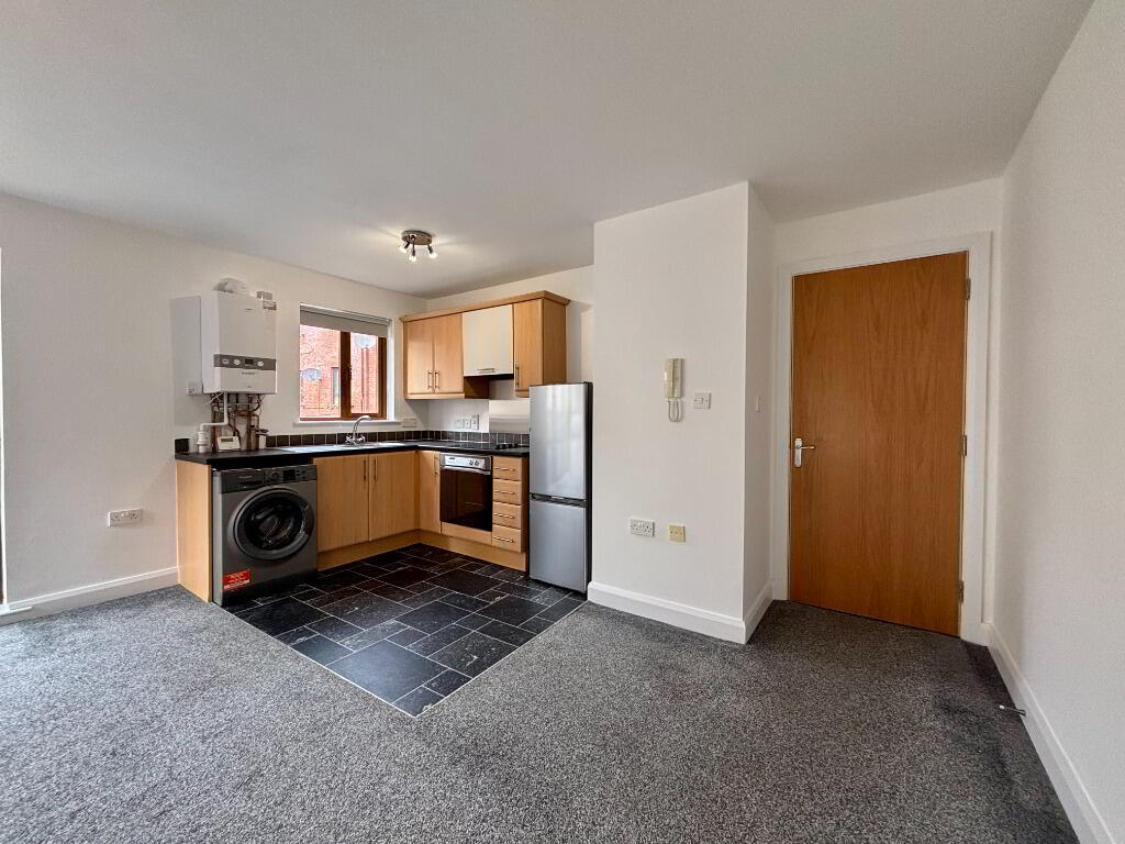 Internally, the apartment comprises a bright open-plan lounge with a modern fitted kitchen including built-in oven, hob, and space for a fridge/freezer and washing machine. There is one spacious double bedroom with built-in storage and a modern white bathroom suite. The property benefits from gas central heating, uPVC double glazing, and intercom access.