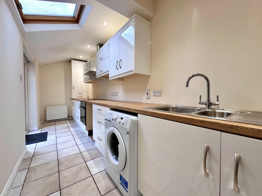 Internally, the property is comprised of a bright, modern open plan lounge and dining area, decorated with glossy hardwood floors and a large bay window overlooking the residential area. Through the lounge is the sleek, contemporary kitchen, designed with lustrous cream kitchen units and complemented with oak countertops and cream tiling. The kitchen further benefits from spotlight lighting and a skylight, brightening the modern kitchen even further. Upstairs, two spacious double bedrooms and a small third bedroom space are situated, all with carpeted flooring and considerable space. The modern bathroom features a three-piece suite including a shower over bath.